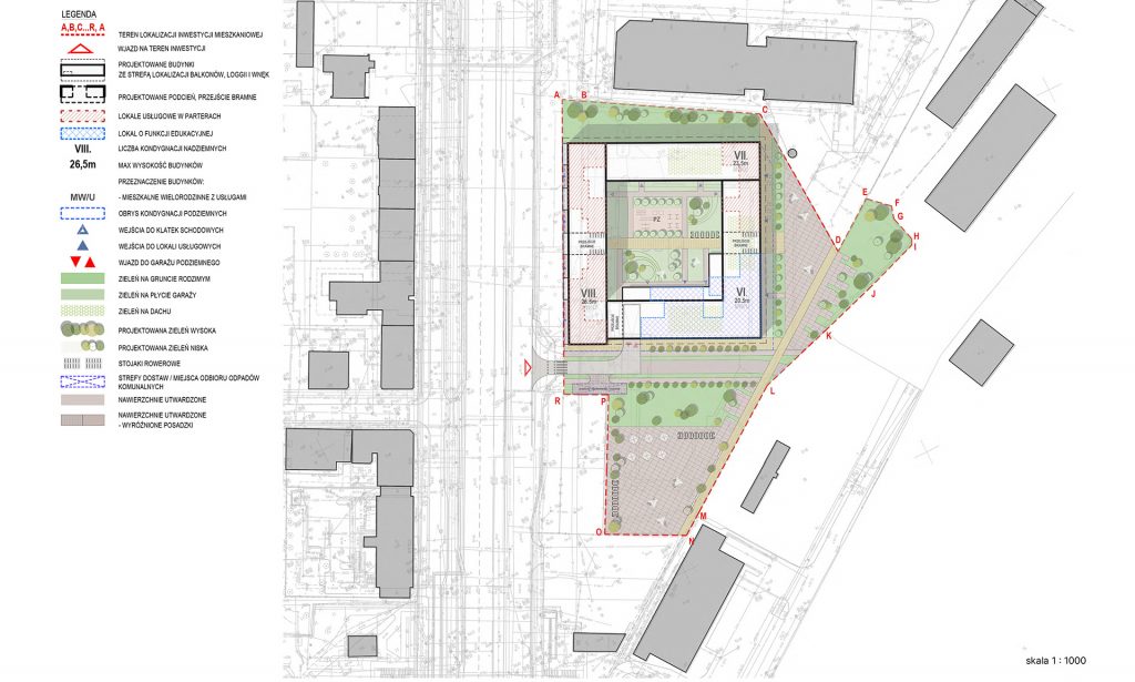- Wysokość projektowanych budynków jest zmienna, VIII kondygnacji od strony ul. Radzymińskiej, VII i VI od strony dziedzińca oraz I – parter usługi oświaty w