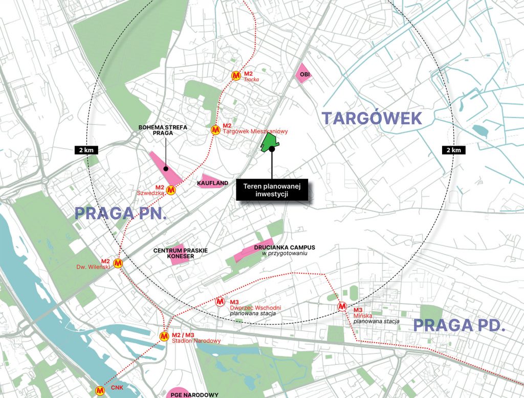 Teren inwestycji mieszkaniowej znajduje się na Targówku, w północnej części Warszawy. Okolica została zaprojektowana i zabudowana w latach 1974–1979 – dominują tu budynki wielorodzinne. W ostatnich latach sąsiedztwo jest stopniowo uzupełniane nową zabudową mieszkaniową, co wpływa na dalszy rozwój i modernizację tej części dzielnicy. Lokalizacja zapewnia dostęp do podstawowej infrastruktury, takiej jak sklepy, szkoły i komunikacja miejska.